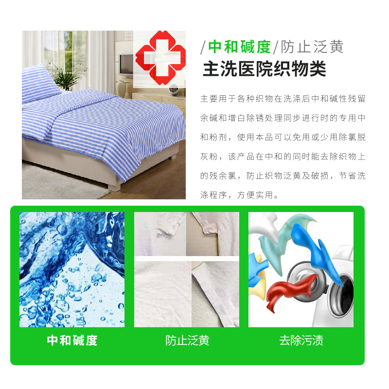 1、主要用于各種織物在洗滌后中和殘留余堿和增白除銹處理同步進(jìn)行時的專用中和劑。